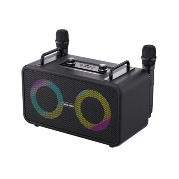 The Ven Dens VD-SPK006 LED Portable Bluetooth Speaker delivers dynamic stereo sound with vibrant LED lights for a lively audio-visual experience. It features dual microphones, making it ideal for karaoke sessions or hands-free calls. With Bluetooth connectivity, it supports wireless music streaming from any compatible device. The compact and portable design, along with a long-lasting rechargeable battery, ensures convenience and extended playtime. Perfect for parties, gatherings, or casual listening, it combines style, functionality, and performance.